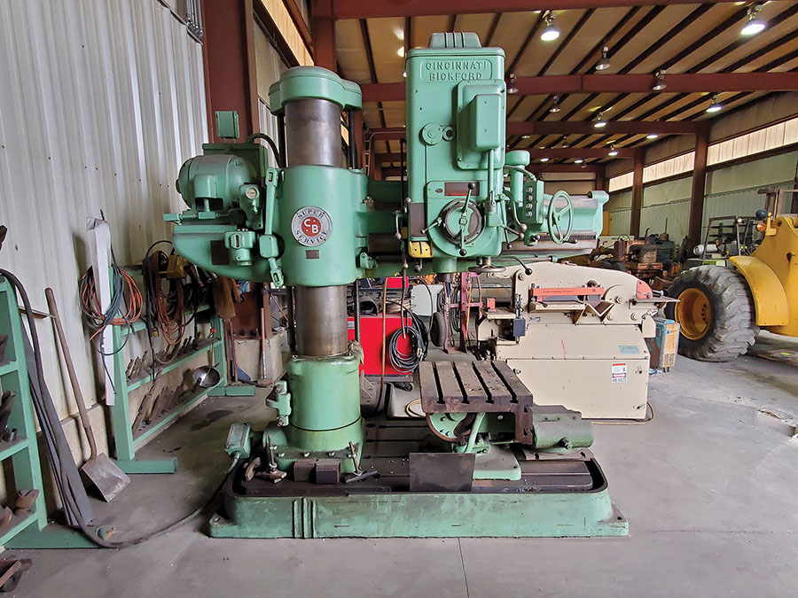 Cincinnati Bickford Super Service Radial Arm Drill, S/N 3E1166, 55-1500 RPM, 13" Column, 60" Arm, L-Bed @ 56" x 36" x 27" x 26", 10-HP, Contour Angle Block, 14" Rotary Machine Vise